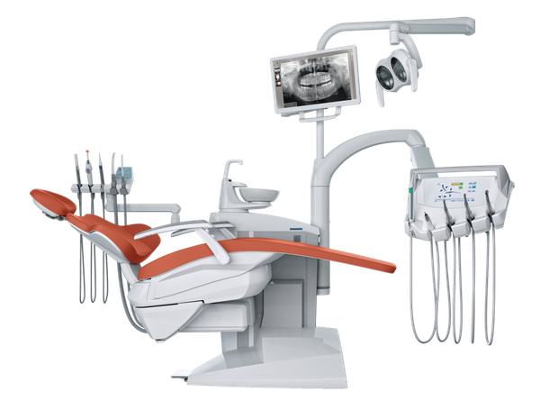 Уникальность модели в большей эргономике за счет крепления кресла пациента на блок плевательницы. Подобное функциональное решение обеспечивает больше свободного пространства для работы врача и ассистента.